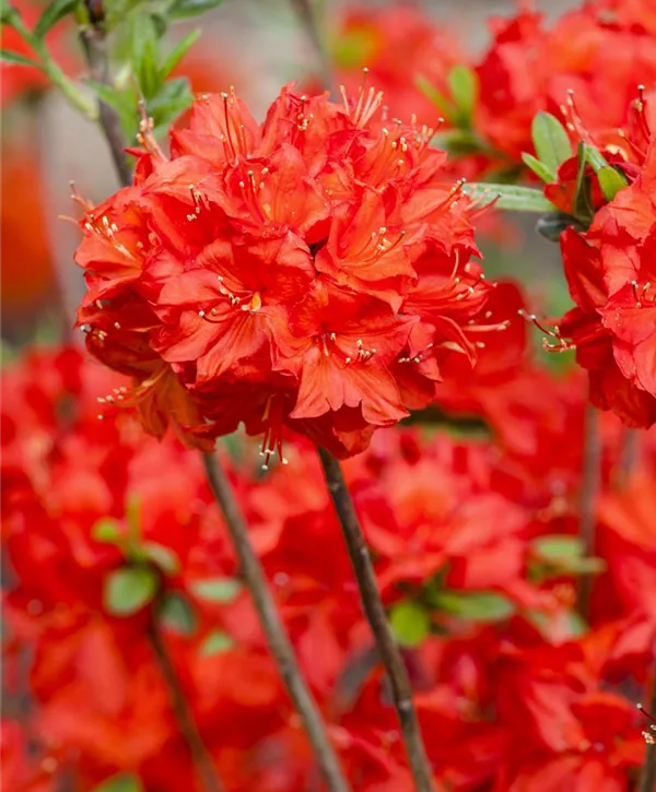 Sytě červeně zbarvená opadavá azalka, vysoká až 250 cm.